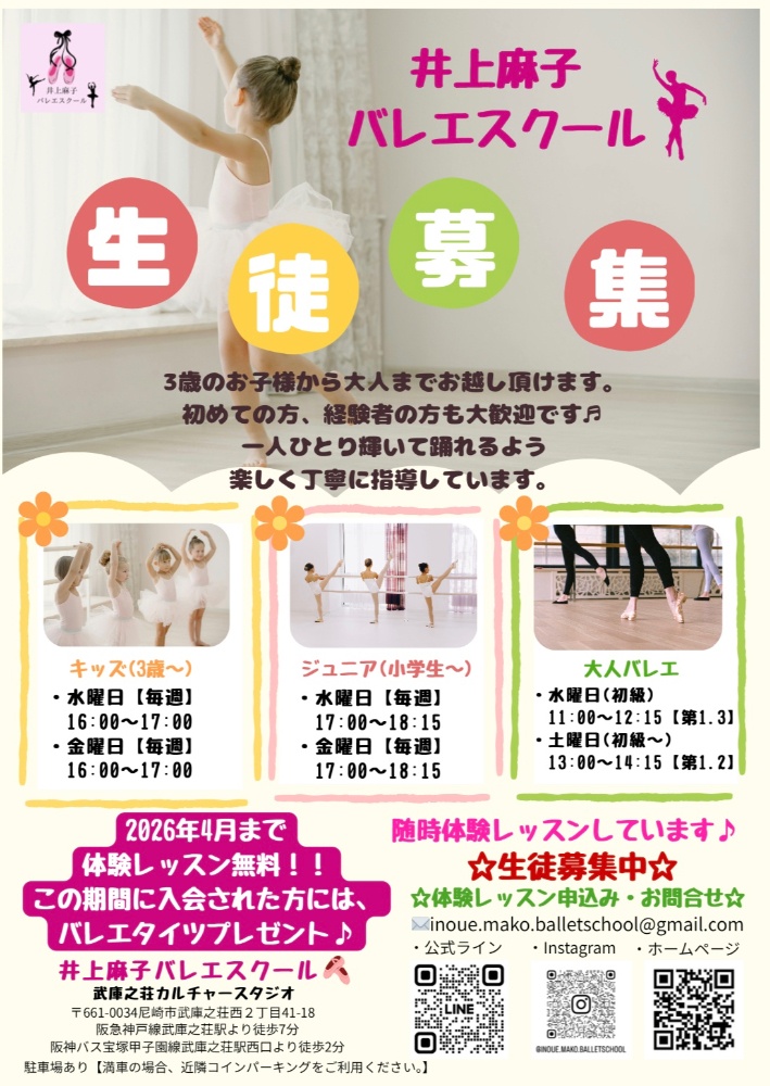 | ・✉ inoue.mako.balletschool@gmail.com ・公式ライン ・インスタDM ・TEL:06-6437-8111(武庫之荘カルチャースタジオ) |